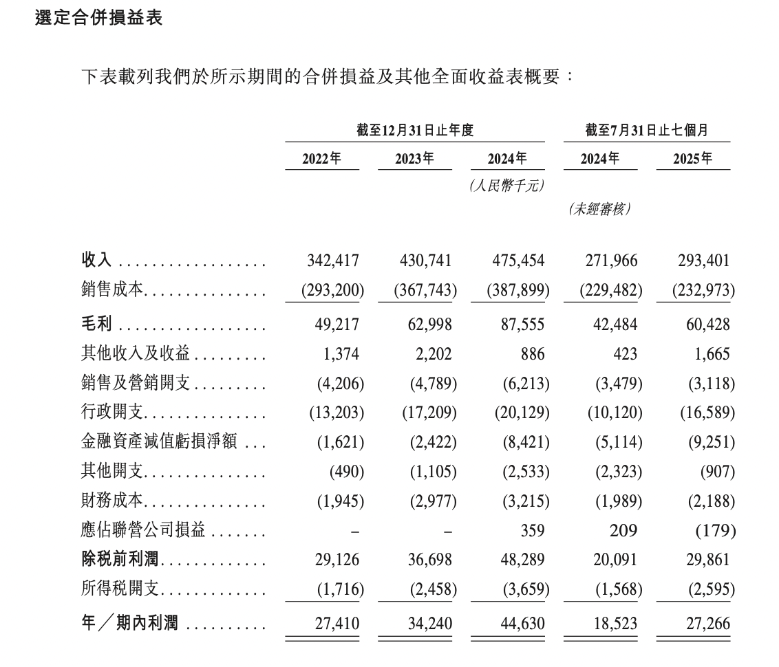 据招股书,2022年-2024年,奥联服务实现收入分别为3.42亿元、4.31亿元、4.75亿元;母公司拥有人应占利润分别为2324.7万元、2751.3万元、3829.1万元。
