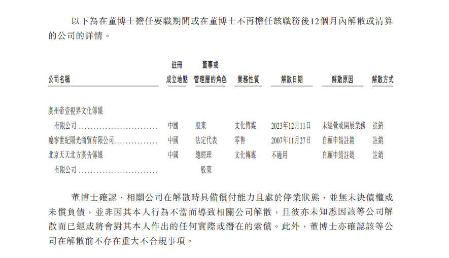 董嘉鹏确认,相关公司在解散时具备偿付能力且处于停业状态,并无未决债权或未偿负债正规手机股票配资论坛,并非因其本人行为不当而导致相关公司解散,且彼亦未知悉因该等公司解散而已经或将会对其本人作出的任何实际或潜在的索偿。此外,董博士亦确认该等公司在解散前不存在重大不合规事项。