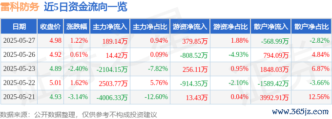 本站消息十大股票配资网址,截至2025年5月27日收盘,雷科防务(002413)报收于4.98元,上涨1.22%,换手率3.31%,成交量40.95万手,成交额2.02亿元。